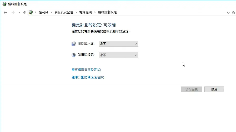 確保電腦隨時處在高效能可以滿足實況所需要的效能 - 設定永遠不關閉螢幕、永遠不待命