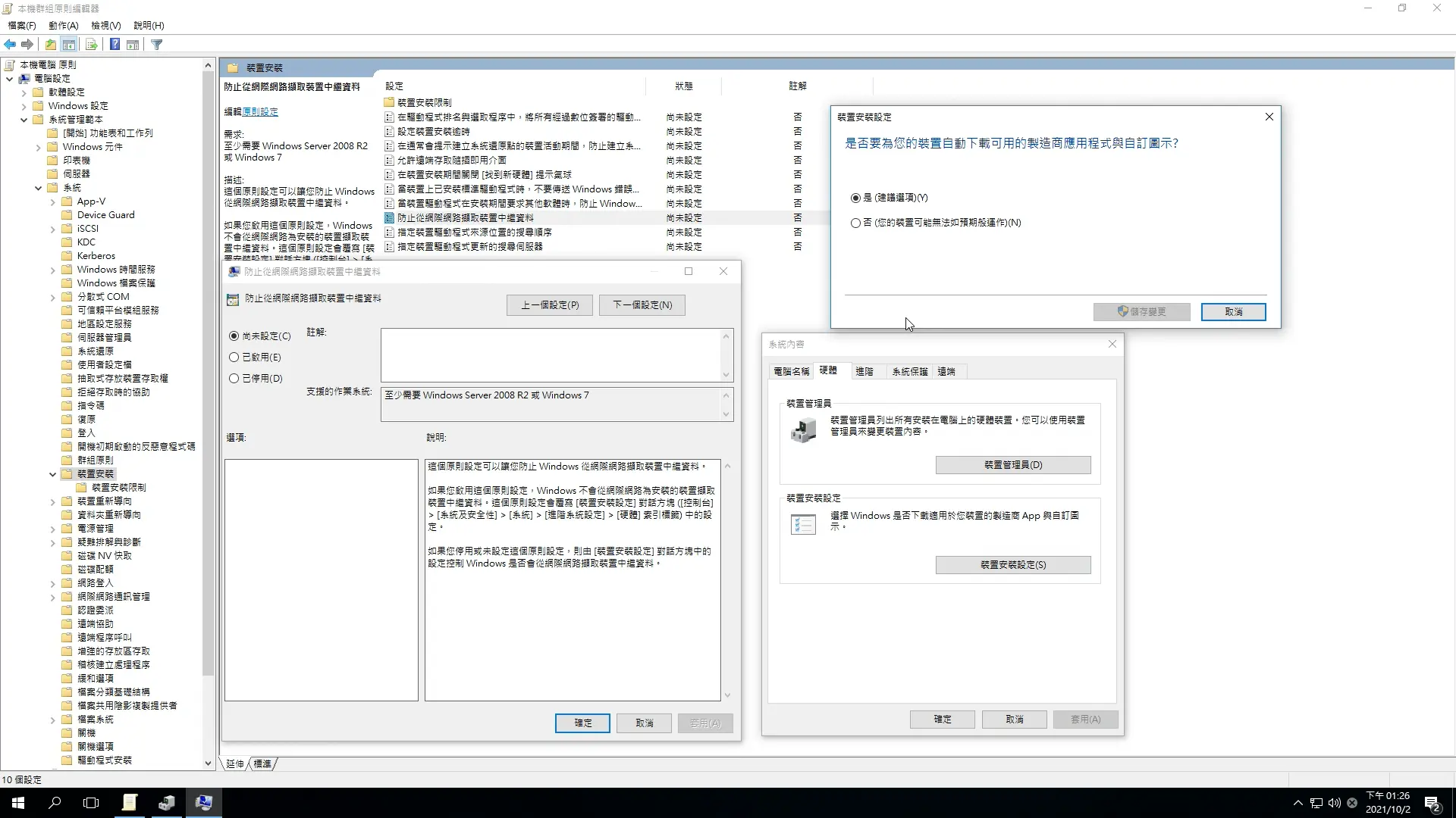 這個原則可以從 系統管理範本 → 系統 → 裝置安裝 → 防止從網際網路擷取裝置中繼資料 看到,它會鎖定 控制台 → 系統及安全性 → 系統 → 進階系統設定 → 硬體 中的 硬體安裝設定,也就是說這兩個設定其實是相同的,只是設定的層級不同(群組原則可以蓋過進階系統設定的選項,如果系統有加入 AD 網域則會蓋過系統群組原則設定)。