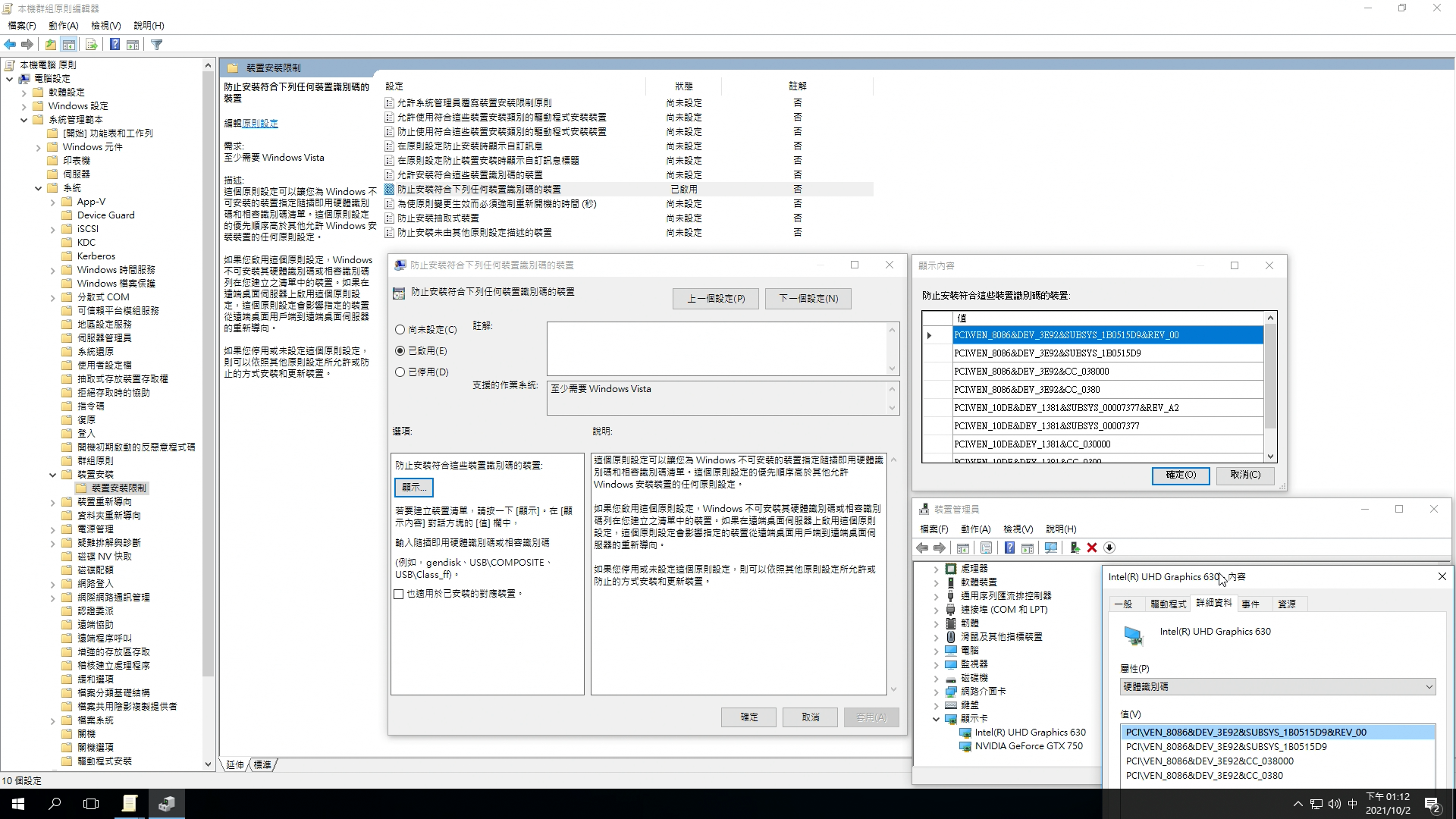 目前測試有效的群組原則設定: 電腦設定 → 系統管理範本 → 系統 → 裝置安裝 → 裝置安裝限制 → 防止安裝符合下列任何裝置識別碼的裝置 ,設定為「已啟用」後,去裝置管理員複製硬體識別碼貼上到群組原則內。