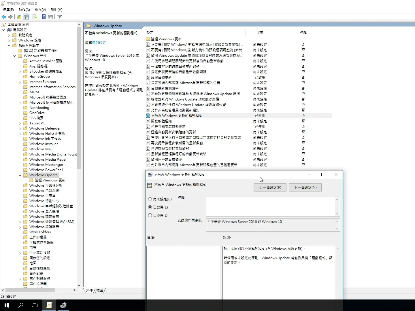 這個原則可以在 系統管理範本 → Windows 元件 → Windows Update → 不包含 Windows 更新的驅動程式 看到。但是設定成已啟用的狀態下,新版驅動程式還是安裝了,顯然這個原則是檔不住的。