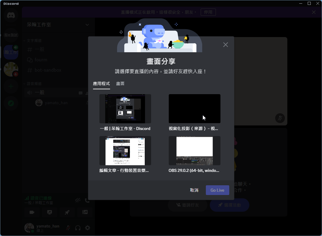 開出預覽視窗之後,回到 Discord 就可以設定直播電腦畫面了,點選「分享您的螢幕」後,接著選擇 OBS 的預覽視窗。